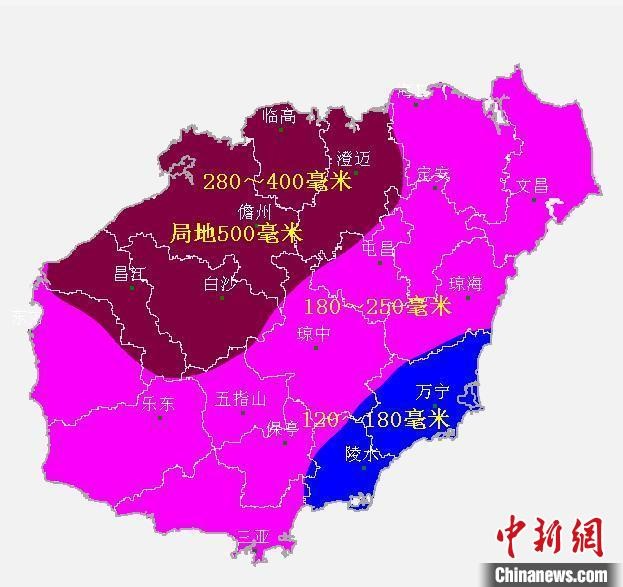 陆地方面,预计21日、22日,海南岛北部和西部地区有大雨到暴雨、局地大暴雨;23日,海南岛北部、西部和中部地区有暴雨到大暴雨、局地特大暴雨;东部和南部地区有大雨到暴雨;24日,海南岛北部和西部地区有暴雨、局地大暴雨,中部、东部和南部地区有大雨到暴雨。