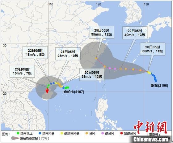 台风“查帕卡”和“烟花”7月20日05时预报路径图。 海南省气象服务中心 供图