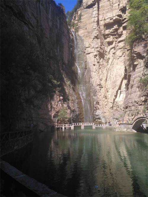 经过山门,爬过一段山路,在山路的拐角处就是百十米落差的齐王瀑布,下面是清澈见底的龙凤潭,潭面不大,曲折的栈道环绕着,环境优美,山如刀削。