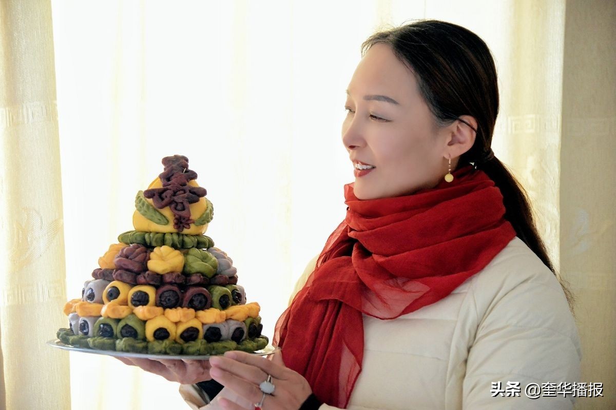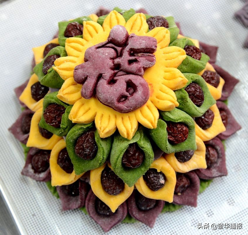 花糕又称枣糕、年糕、糕,在这里权称“花糕”吧。是中华传统食品的一种,年糕不同于粘糕,其粘糕是黏米面制作的,正常是制作粘枣窝窝。花糕是每到进了年腊月二十三,娘家母亲或者长辈给新女婿、近亲晚辈制作的节后回的“年礼”,其外形为宝塔形状,寓意为工作、事业、家庭步步高。其原料多为面粉、枣。更有巧妇将花糕制作成各种样式,有动物、花卉、四季果、蔬造型等。回赠新女婿的糕,每年逐渐增高,比如第一年三层、第二年4层、第三年5层,相应的每年的体积与重量也逐年递增,小的糕3斤左右,中等的6斤左右,大的15斤左右,今年看到了一个最大的花糕,重大128斤。在婚礼上也经常看到新娘子下轿(下车)先用足登糕的习俗又称新娘子过门,寓意日子越过越红火、幸福生活一天比一天高。还有老人过寿、添子添孙,近亲长辈与同辈也专门制作花糕,送老人、送同辈的子、孙等,其寓意略有不同,送老人祝老人高寿,送子、孙寓意越长越高等等。春节各家各户给家祖上供也离不开年糕,一般把糕放在供桌里面的正中位置,寓意为尊重祖先,祖先为“高”为“大”。