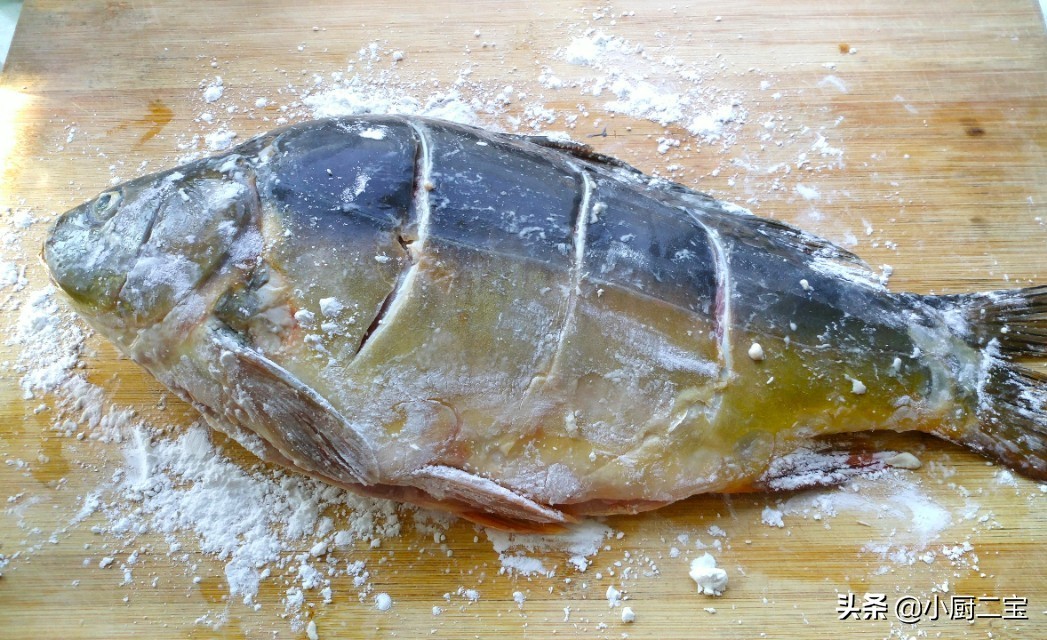 2、三道鳞放到菜板上,鱼身刮几刀,把干淀粉涂满鱼身,这样一会煎炸时油锅的油不会四处乱溅。